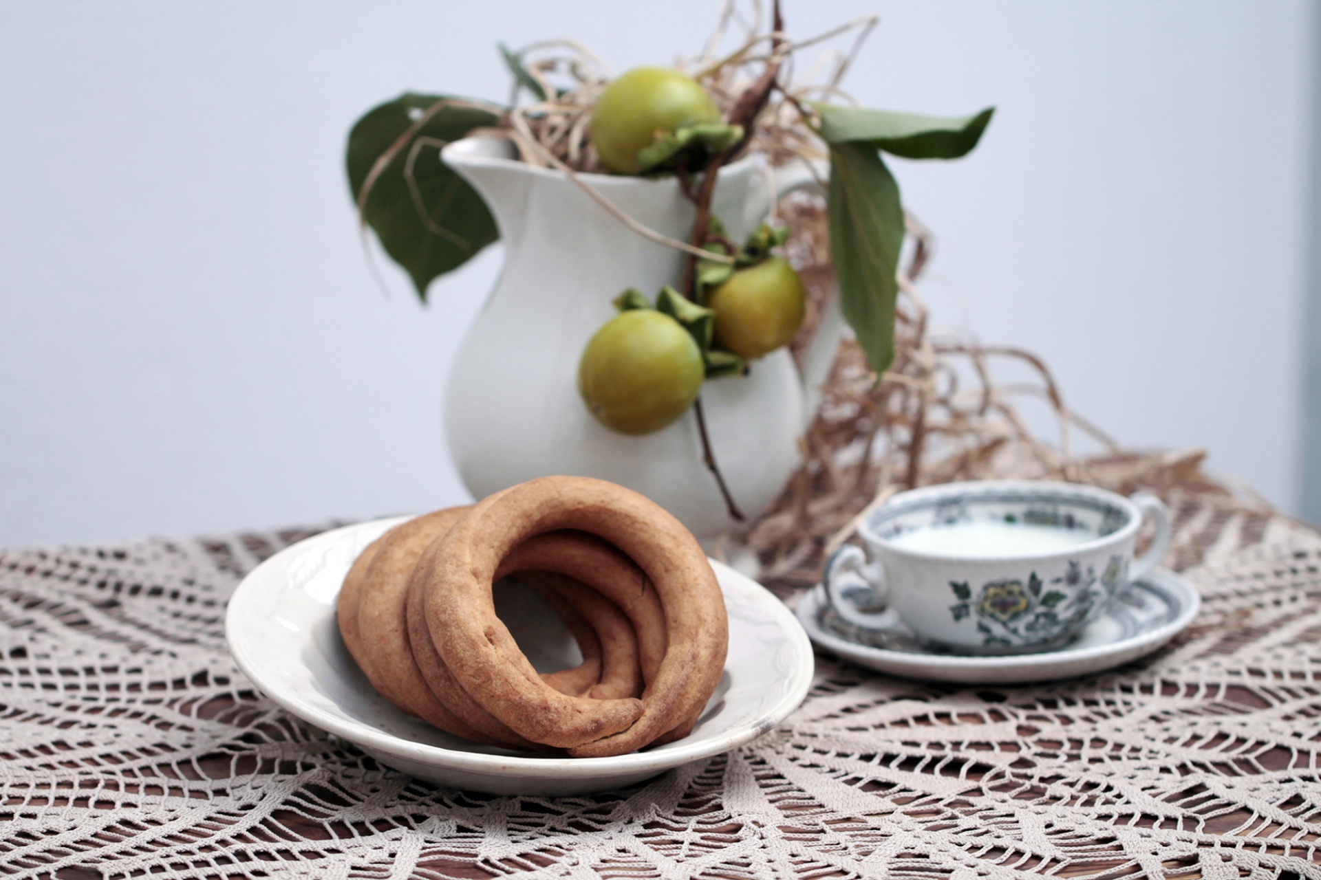 Biscoitos redondos dourados em prato branco com chávena azul floral, toalha de renda e vaso branco com frutas e folhas.