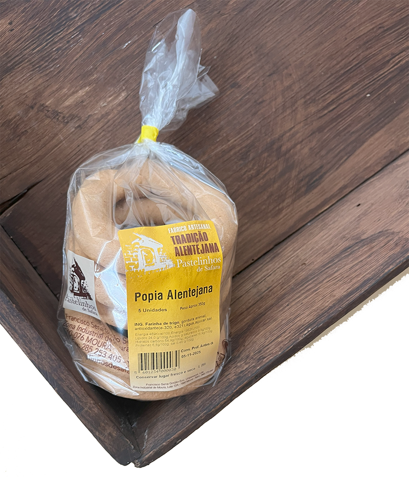 Pacote de Pastelaria Tradicional Alentejana em plástico transparente com etiqueta amarela